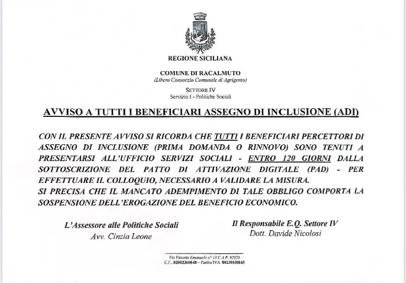 Avviso ai beneficiari dell'Assegno di Inclusione