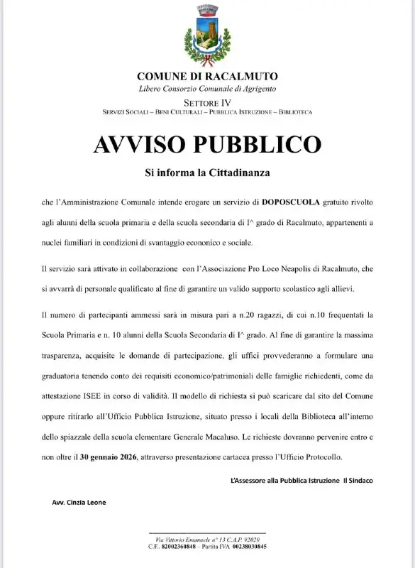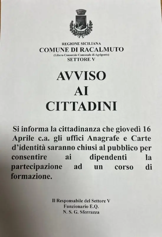 Si informa la cittadinanza che giovedì 16 Aprile c.a. gli uffici Anagrafe e Carte d’identità saranno chiusi al pubblico per consentire ai dipendenti la partecipazione ad un corso di formazione.
