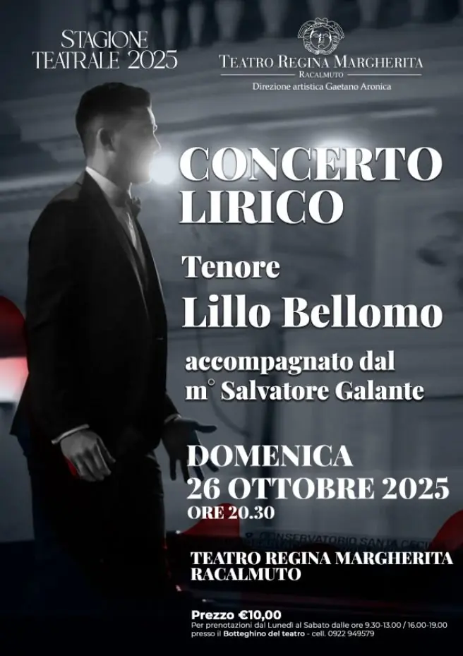 🎭 STAGIONE TEATRALE 2025 – 4° APPUNTAMENTO 🎶 📅 Domenica 26 ottobre 2025 🕣 Ore 20:30 📍 Teatro Regina Margherita – Racalmuto Vi aspettiamo per un emozionante Concerto Lirico con il Tenore Lillo Bellomo, accompagnato al pianoforte dal M° Salvatore Galante. Un viaggio tra le più belle arie e romanze del